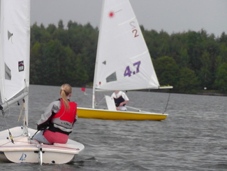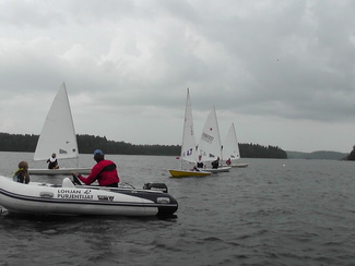 Leirin osallistujat - valmentaja Jonas ja apuvalmentaja Kaisa sekä 4 purjehtijaa